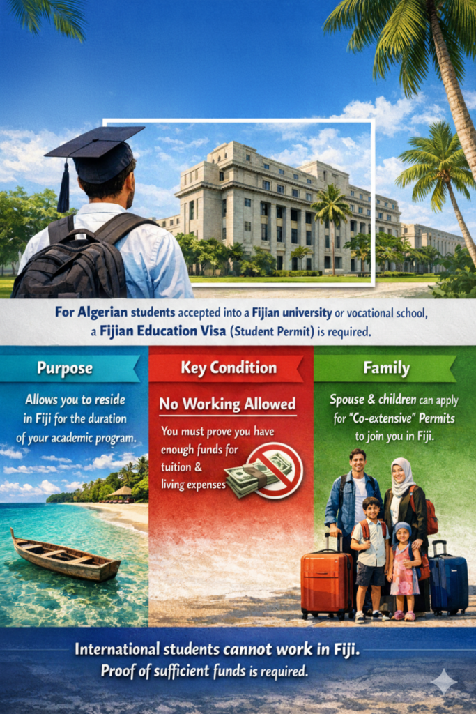 For Algerian students who have been accepted into a Fijian university or vocational school, a Fijian Education Visa (formally known as a Student Permit) is required.