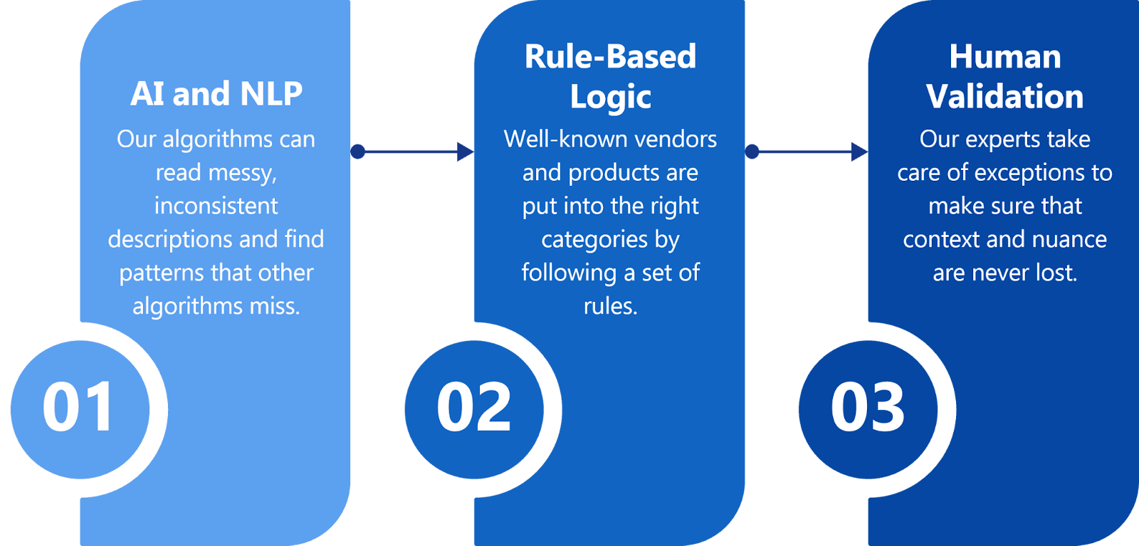 Manual classification is slow, inconsistent, and prone to human error — especially for large enterprises handling millions of transactions. That is why UnivDatos applies a hybrid model combining automation with expert validation.